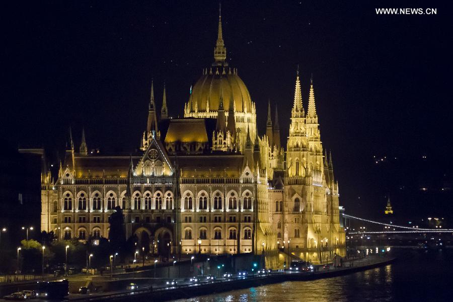 Photo taken on Aug. 2, 2014 shows the Hungarian Parliament illuminated by new decorative lights in Budapest, Hungary. (Xinhua/Attila Volgyi)