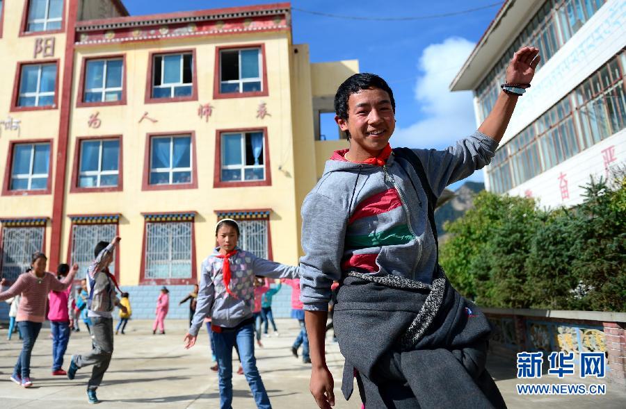 Students perform folk dances at Jiujia Elementary School in Labrang town of Xiahe county, northwest China's Gansu province on Sept. 2, 2014. (Xinhua News Agency/Zhang Meng)
