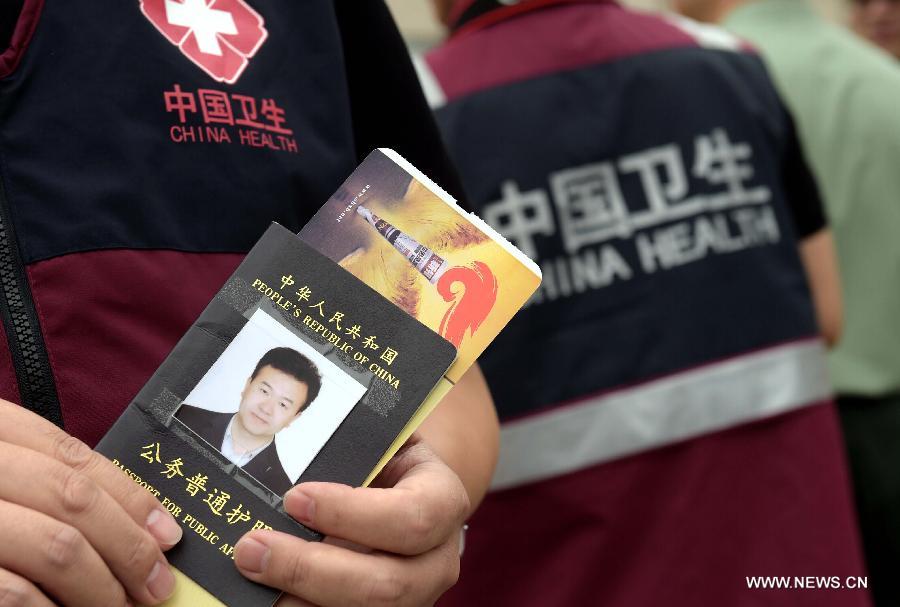Qian Jun, head of a Chinese laboratory team, holds his passport before departing for Sierra Leone to help West African countries to contain the Ebola epidemic, in Beijing, capital of China, Sept. 16, 2014. The 59-member team, based at the Sierra Leone-China Friendship Hospital in the outskirts of the capital, Freetown, will carry out lab screening and observation to help Sierra Leone to improve lab testing. (Xinhua/Jin Liangkuai)