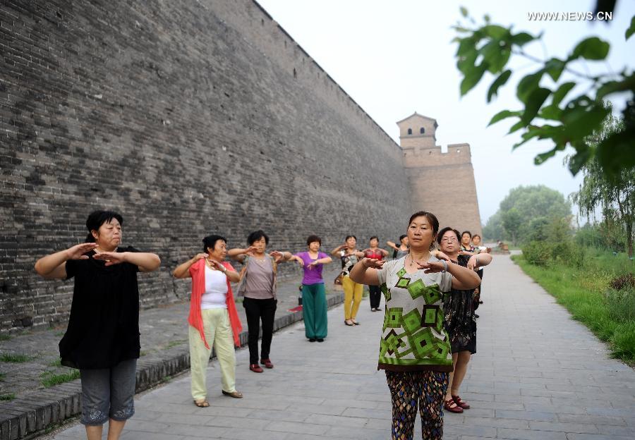 Residents dance in Pingyao Ancient Town, Pingyao County, north China's Shanxi Province, Aug. 1, 2014. Located in Jinzhong Basin of Shanxi Province, the 2700-year-old Pingyao Ancient Town is one of the most well-preserved ancient towns in China. Pingyao, which was added to the World Heritage List by UNESCO in 1997, attracts numerous tourists from all over the world. (Xinhua/Yan Yan) |