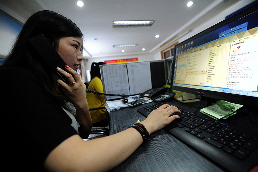 A customer service staff member of a crab company processes online orders. [Photo/Xinhua]