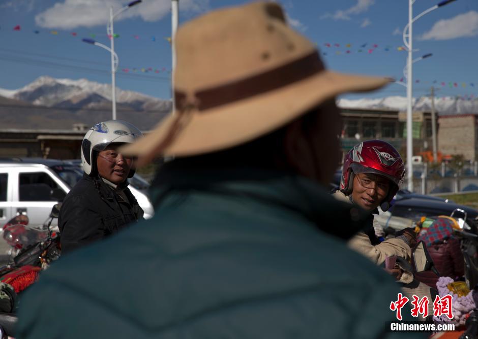 Local people wait to refuel their motorcycles at a gas station in Dangxiong County of Lhasa, capital of southwest China's Tibet Autonomous Region, Sept. 28, 2014. (Chinanews.com/Liu Guanguan)