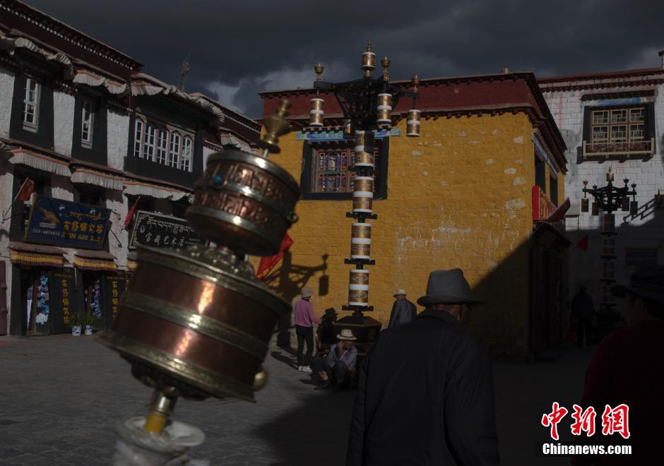 A Buddhist prayer turns the prayer wheel around the Jokhang Temple in Lhasa, capital of southwest China's Tibet Autonomous Region, Sept. 29, 2014. (Chinanews.com/Liu Guanguan)