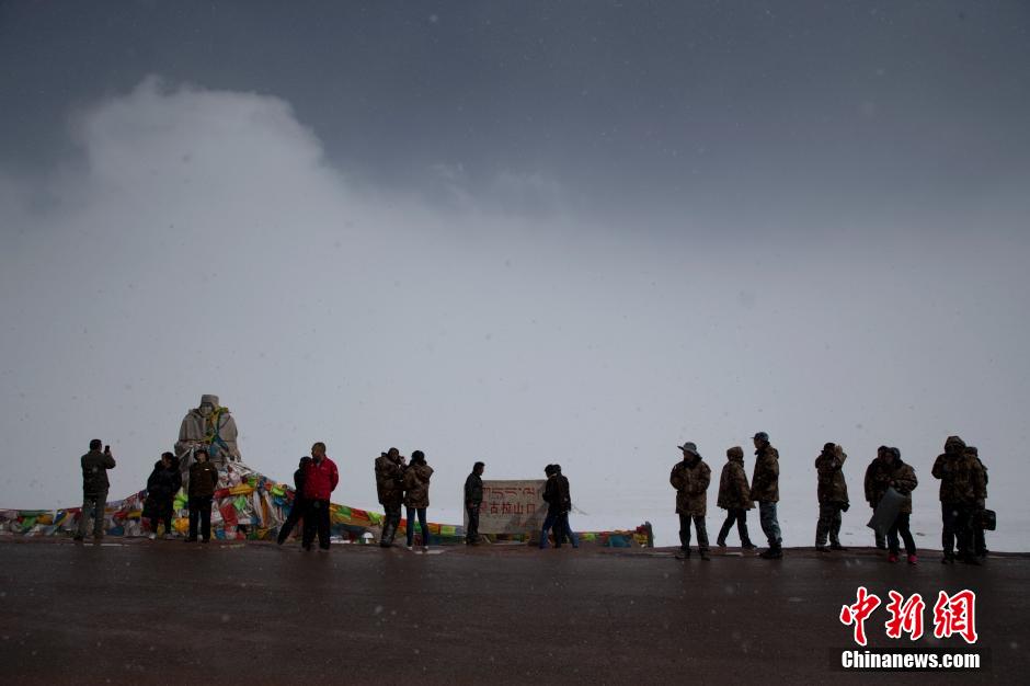 Tourists take photos at Tanggula Pass in snow, Sept. 27, 2014. Tanggula Pass is the highest the highest point on the Qinghai-Tibet Highway (5,231metres). (Chinanews.com/Liu Guanguan)