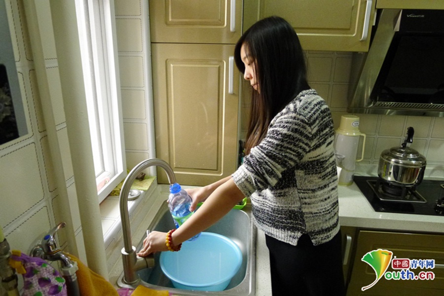 Xiao Ji holds the water with a bottle. In cold winter, people always like to drink hot water. Xiao Ji never wastes cold water and wash the dishes with it. (Youth.cn/Gao Lei)