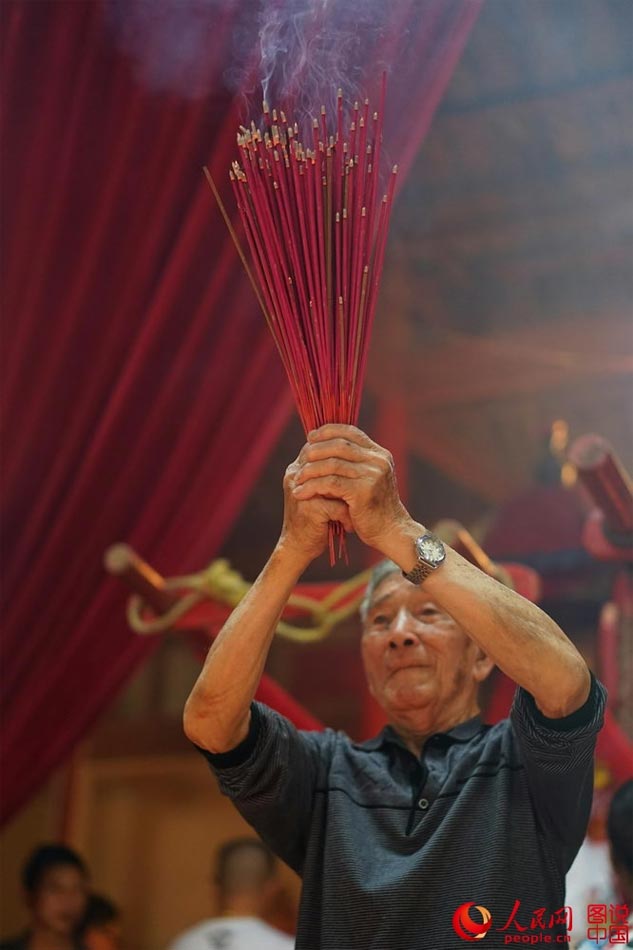 A follower of Mazu worships in a Mazu temple in Xiapu County, southeast China's Fujian Province, May 14, 2015. (Photo/people.cn)