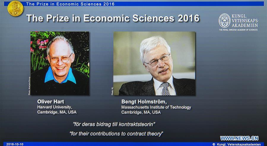 Photo taken on Oct. 10, 2016 shows the portraits of the two winners of the 2016 Nobel Prize in Economics on a screen at a press conference held by the Royal Swedish Academy of Sciences in Stockholm, Sweden. The 2016 Nobel Prize in Economics, or officially the Sveriges Riksbank Prize in Economic Sciences in Memory of Alfred Nobel, has been awarded jointly to Oliver Hart and Bengt Holmstrom "for their contributions to contract theory". (Xinhua/Shi Tiansheng)