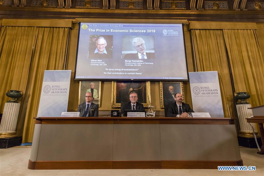 Photo taken on Oct. 10, 2016 shows the scene of the press conference held by the Royal Swedish Academy of Sciences to announce the winners of the 2016 Nobel Prize in Economics in Stockholm, Sweden. The 2016 Nobel Prize in Economics, or officially the Sveriges Riksbank Prize in Economic Sciences in Memory of Alfred Nobel, has been awarded jointly to Oliver Hart and Bengt Holmstrom "for their contributions to contract theory". (Xinhua/Shi Tiansheng)