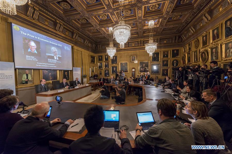 Photo taken on Oct. 10, 2016 shows the scene of the press conference held by the Royal Swedish Academy of Sciences to announce the winners of the 2016 Nobel Prize in Economics in Stockholm, Sweden. The 2016 Nobel Prize in Economics, or officially the Sveriges Riksbank Prize in Economic Sciences in Memory of Alfred Nobel, has been awarded jointly to Oliver Hart and Bengt Holmstrom "for their contributions to contract theory". (Xinhua/Shi Tiansheng)