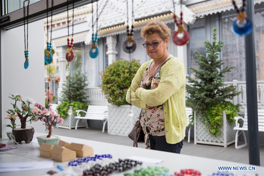 A woman visits a Chinese temple fair in Moscow, Russia, July 17, 2017. The 4-day Chinese temple fair opened here on July 15. (Xinhua/Bai Xueqi)