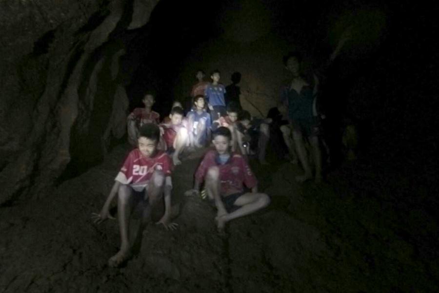 Photo provided by Thai Navy Seal shows trapped teenagers in a cave in Mae Sai, Chiang Rai province, northern Thailand, on July 2, 2018. Twelve teenagers and their football coach, trapped in a cave in northern Thailand for nine days, have been found alive on Monday night, Narongsak Osottanakorn, governor of Chiang Rai province said. (Xinhua)