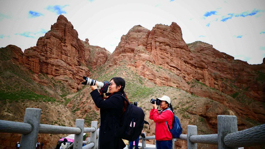 Journalists take photos of the beautiful scenery of Danxia Landform in Zhangye, northwest China's Gansu Province. (Photo/Courtesy of Zhao Jianwei)