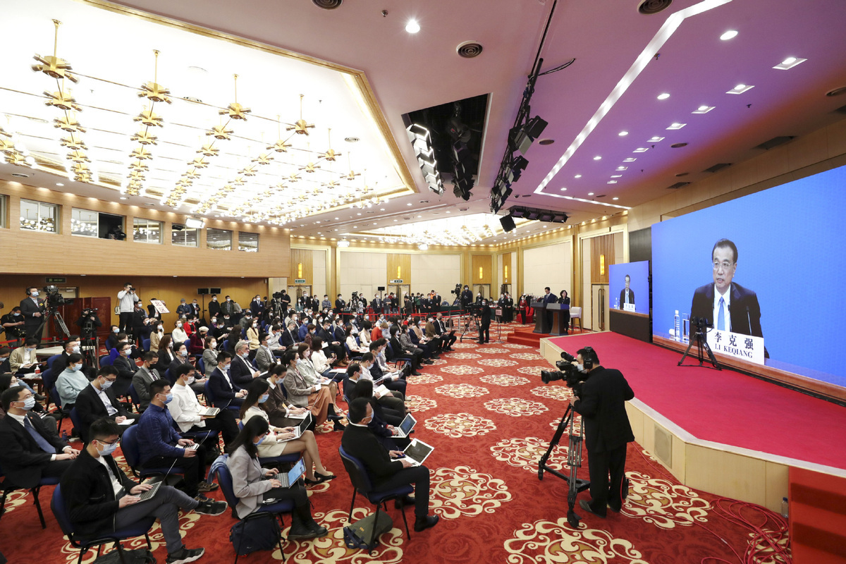Premier Li Keqiang meets the press via video link after the closing of the fourth session of the 13th National People's Congress at the Great Hall of the People in Beijing, March 11, 2021. [Photo/Xinhua]