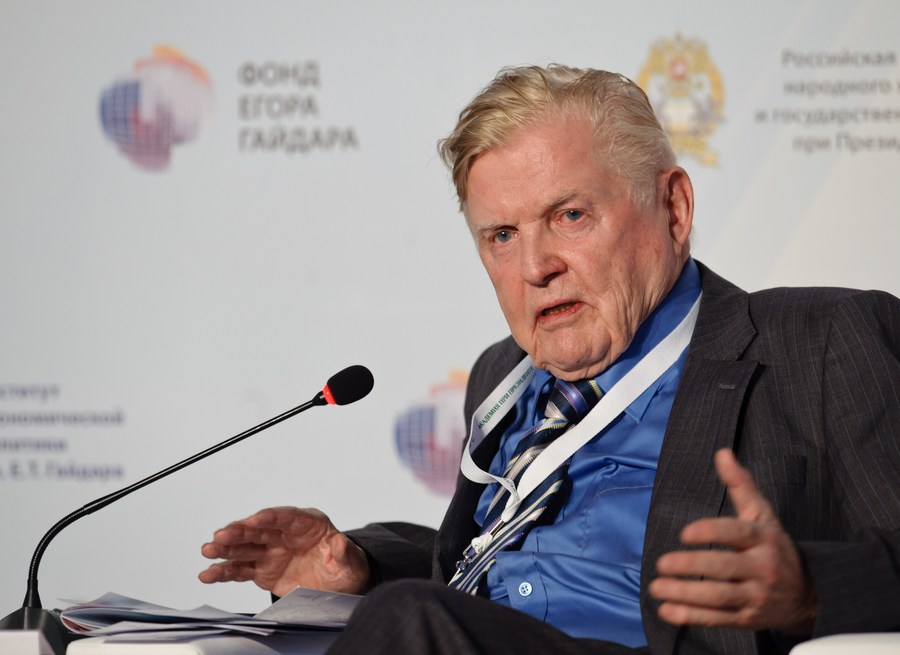 File photo taken on Jan. 16, 2013 shows Nobel Prize-winning economist Robert A. Mundell addressing the Gaidar forum in Moscow, Russia. (Xinhua/Jiang Kehong)
