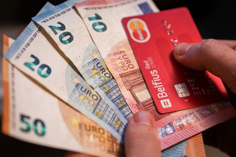 File photo taken on Dec. 31, 2018 shows a citizen with euro notes in hand in Brussels, Belgium. (Xinhua/Zheng Huansong)
