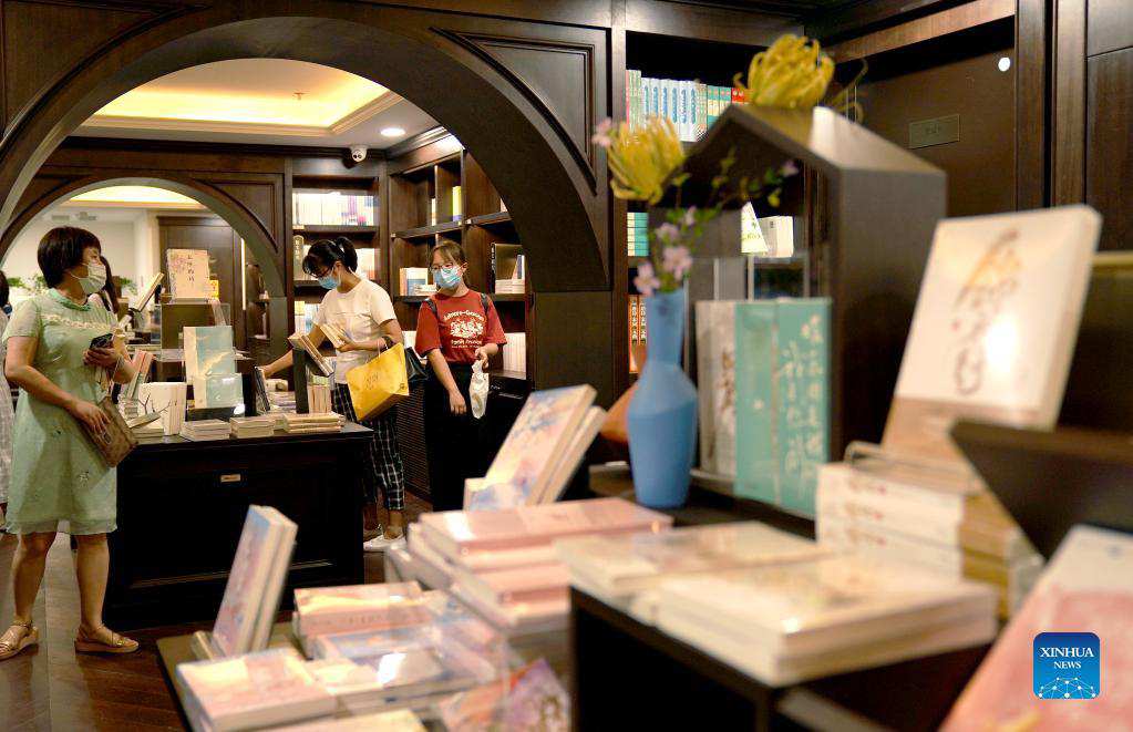 People are seen at the Bell Tower Bookstore in Xi'an, northwest China's Shaanxi Province, Aug. 25, 2021. The Bell Tower Bookstore was built in 1955 as the first state-run bookstore in Xi'an and was known as a cultural landmark of the city. In 2008, in order to protect the cultural heritage, the bookstore was moved to another place. Recently, the Bell Tower Bookstore was moved back to its original site after maintenance which basically restored its original appearance in the 1950s, so that citizens and tourists can once again experience the historical and cultural atmosphere while reading books in the store. (Xinhua/Liu Xiao)