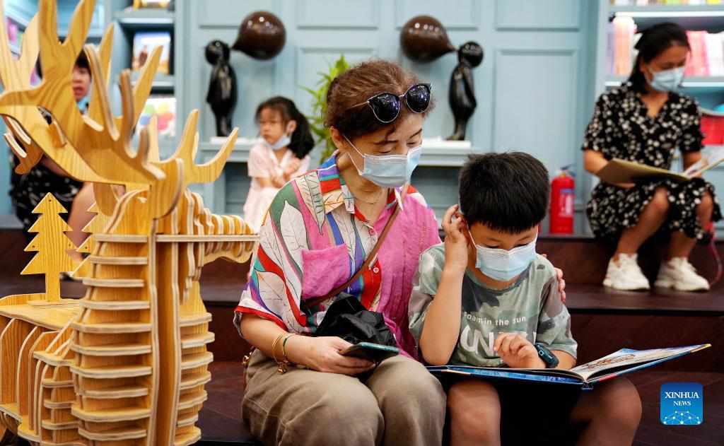 People read books at the Bell Tower Bookstore in Xi'an, northwest China's Shaanxi Province, Aug. 27, 2021. The Bell Tower Bookstore was built in 1955 as the first state-run bookstore in Xi'an and was known as a cultural landmark of the city. In 2008, in order to protect the cultural heritage, the bookstore was moved to another place. Recently, the Bell Tower Bookstore was moved back to its original site after maintenance which basically restored its original appearance in the 1950s, so that citizens and tourists can once again experience the historical and cultural atmosphere while reading books in the store. (Xinhua/Liu Xiao)