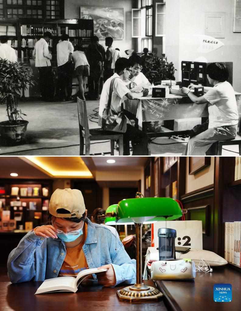 Combo photo shows people reading books at the Bell Tower Bookstore in the 1970's (Top, provided by the Bell Tower Bookstore) and a woman reading a book at the Bell Tower Bookstore on Aug. 27, 2021 (Bottom, taken by Liu Xiao), in Xi'an, northwest China's Shaanxi Province. The Bell Tower Bookstore was built in 1955 as the first state-run bookstore in Xi'an and was known as a cultural landmark of the city. In 2008, in order to protect the cultural heritage, the bookstore was moved to another place. Recently, the Bell Tower Bookstore was moved back to its original site after maintenance which basically restored its original appearance in the 1950s, so that citizens and tourists can once again experience the historical and cultural atmosphere while reading books in the store. (Xinhua/Liu Xiao)