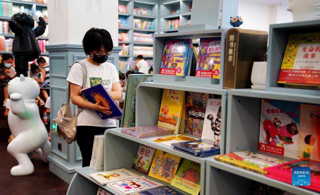 People read books at the Bell Tower Bookstore in Xi'an, northwest China's Shaanxi Province, Aug. 27, 2021. The Bell Tower Bookstore was built in 1955 as the first state-run bookstore in Xi'an and was known as a cultural landmark of the city. In 2008, in order to protect the cultural heritage, the bookstore was moved to another place. Recently, the Bell Tower Bookstore was moved back to its original site after maintenance which basically restored its original appearance in the 1950s, so that citizens and tourists can once again experience the historical and cultural atmosphere while reading books in the store. (Xinhua/Liu Xiao)
