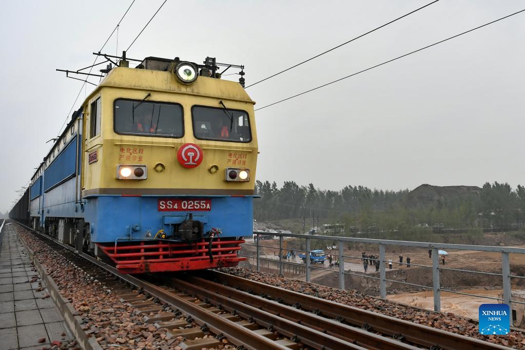 Photo taken on Oct. 14, 2021 shows a train running through Changyuan River Bridge on Nantongpu Railway in Qixian County, north China's Shanxi Province. The traffic on Changyuan River Bridge of Nantongpu Railway, which was disrupted due to continuous rainstorms, resumed in both directions Thursday morning after a rush repair. (Xinhua/Cao Yang)
