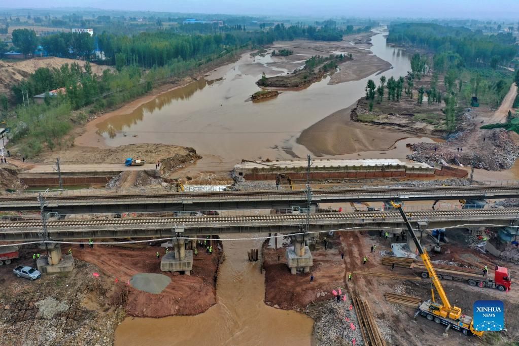 Aerial photo taken on Oct. 13, 2021 shows constructors working at the repair site of Changyuan River Bridge on Nantongpu Railway in Qixian County, north China's Shanxi Province. The traffic on Changyuan River Bridge of Nantongpu Railway, which was disrupted due to continuous rainstorms, resumed in both directions Thursday morning after a rush repair. (Xinhua/Cao Yang)
