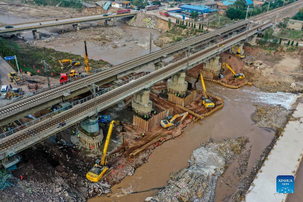 Aerial photo taken on Oct. 13, 2021 shows constructors working at the repair site of Changyuan River Bridge on Nantongpu Railway in Qixian County, north China's Shanxi Province. The traffic on Changyuan River Bridge of Nantongpu Railway, which was disrupted due to continuous rainstorms, resumed in both directions Thursday morning after a rush repair. (Xinhua/Cao Yang)