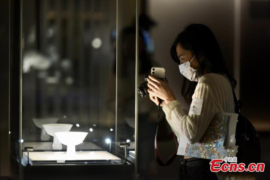 Visitors stop at a white high foot bowl glazed with dim dragon ornamentation at an exhibition in Hong Kong, Nov.3, 2021. (Photo: China News Service/Li Zhihua)