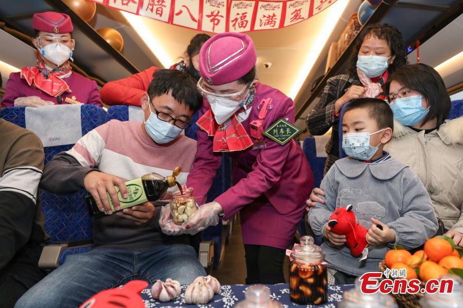 A passenger on Fuxing EMU (C5980) learns to make Laba garlic, Bijie, January 9, 2022. (Photo: China News Service/Qu Honglun)