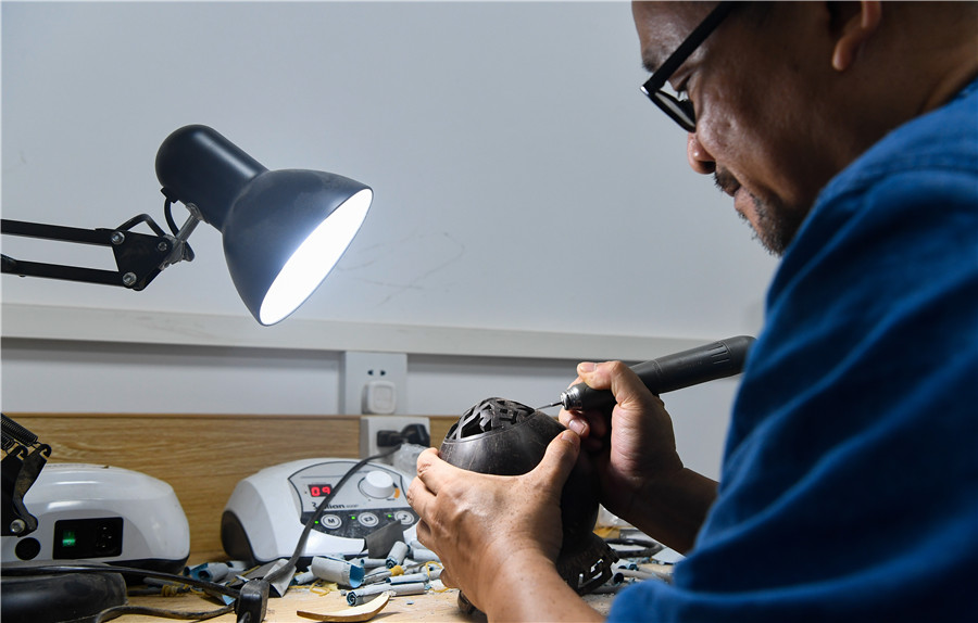 Zhang Bidi makes coconut carvings in Qionghai city, South China's Hainan province, on Feb 18, 2022. [Photo/Xinhua]