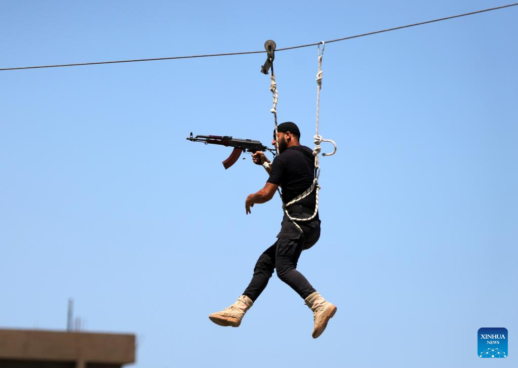 A member of the Palestinian Hamas security forces shows his skills as he takes part in a military graduation ceremony in the southern Gaza Strip city of Khan Younis, on June 30, 2022. (Photo by Yasser Qudih/Xinhua)