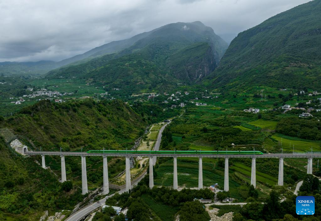 In this aerial photo, a bullet train runs for trial on a bridge along the Dali-Baoshan section of Dali-Ruili Railway in southwest China's Yunnan Province, July 19, 2022.