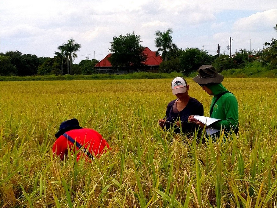 A Chinese expert instructs a local technician to record rice growth in a demonstration base of hybrid rice growing in Pampanga, the Philippines. (Photo courtesy of the Philippine-Sino Center for Agricultural Technology)