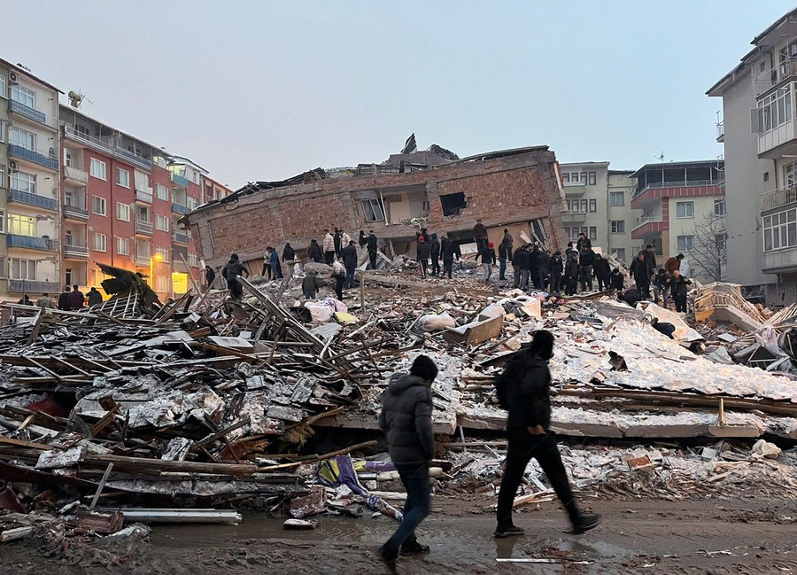 People check damaged buildings after the earthquakes in Malatya, Türkiye, on Feb. 6, 2023. (Photo by Mustafa Kaya/Xinhua)