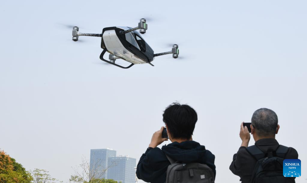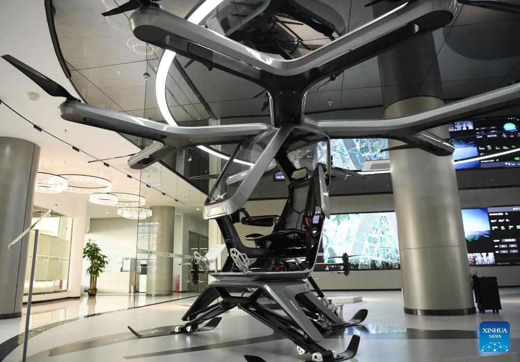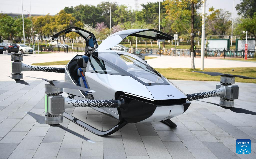 This photo taken on Feb. 24, 2023 shows a XPeng X2 flying car at the headquarters of XPeng Aeroht in Guangzhou, south China's Guangdong Province. Guangzhou, one of China's major car manufacturing bases, has been striving to attract investment in new energy vehicle (NEV) industry in recent years. (Xinhua/Deng Hua)