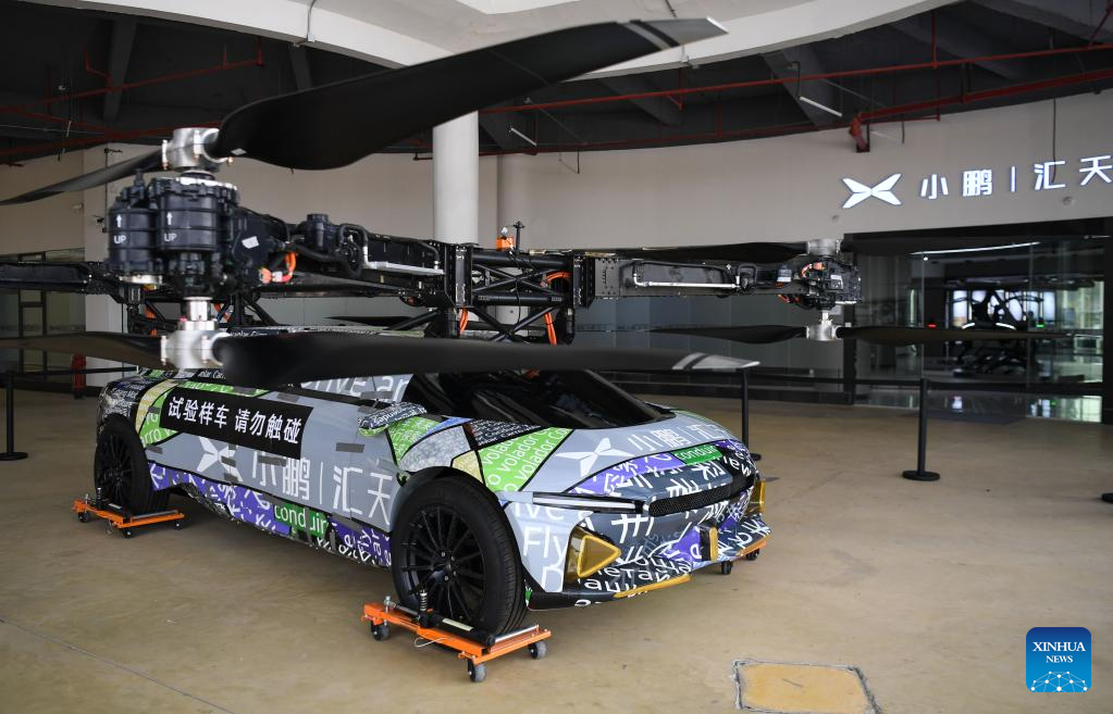 A test flying car of XPeng is displayed at the headquarters of XPeng Aeroht in Guangzhou, south China's Guangdong Province, Feb. 24, 2023. Guangzhou, one of China's major car manufacturing bases, has been striving to attract investment in new energy vehicle (NEV) industry in recent years. (Xinhua/Deng Hua)