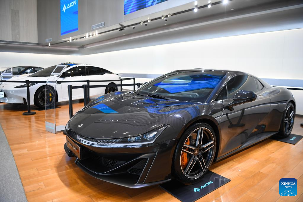 This photo taken on Feb. 24, 2023 shows a new energy supercar at GAC Aion, an NEV subsidiary of Guangzhou Automobile Group Co., Ltd. (GAC Group), in Guangzhou, south China's Guangdong Province. Guangzhou, one of China's major car manufacturing bases, has been striving to attract investment in NEV industry in recent years. (Xinhua/Deng Hua)