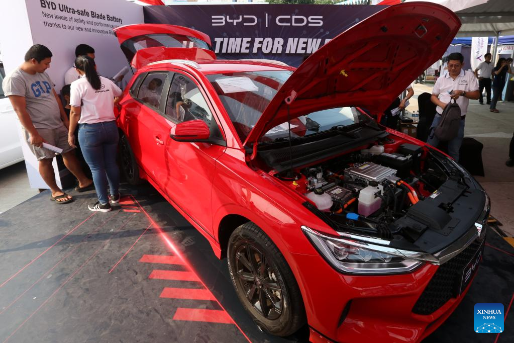 Visitors look at a BYD Dolphin electric car imported from China at the Pannita Auto Fair in Yangon, Myanmar, March 2, 2023. Myanmar has imported the first batch of Chinese-made battery electric vehicles (BEVs) in January in implementing its one-year pilot EV project. (Photo by Myo Kyaw Soe/Xinhua)