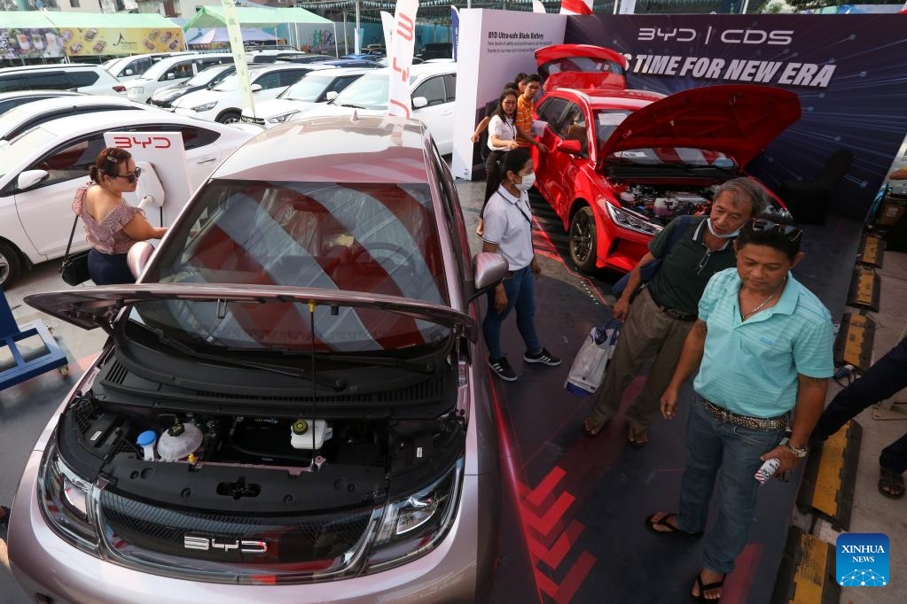 This photo taken on March 2, 2023 shows BYD electric cars at the Pannita Auto Fair in Yangon, Myanmar. Myanmar has imported the first batch of Chinese-made battery electric vehicles (BEVs) in January in implementing its one-year pilot EV project. (Photo by Myo Kyaw Soe/Xinhua)