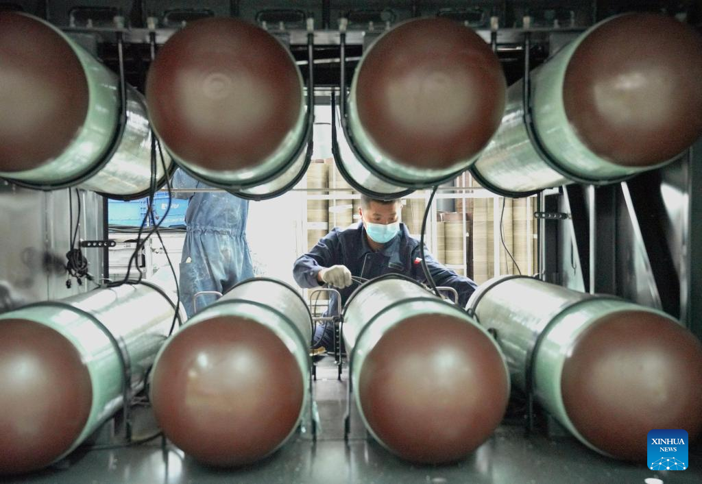 A staff member assembles natural gas pipeline for a vehicle at a work shop of the new energy factory of Zhengzhou Yutong Bus Co., Ltd. in Zhengzhou, central China's Henan Province, March 8, 2023. To catch orders, staff of the new energy factory of Yutong are busy on the assembly line. Since the beginning of this year, Yutong. who exported its bus to more than 30 countries and regions, has won many overseas orders. (Xinhua/Li An)