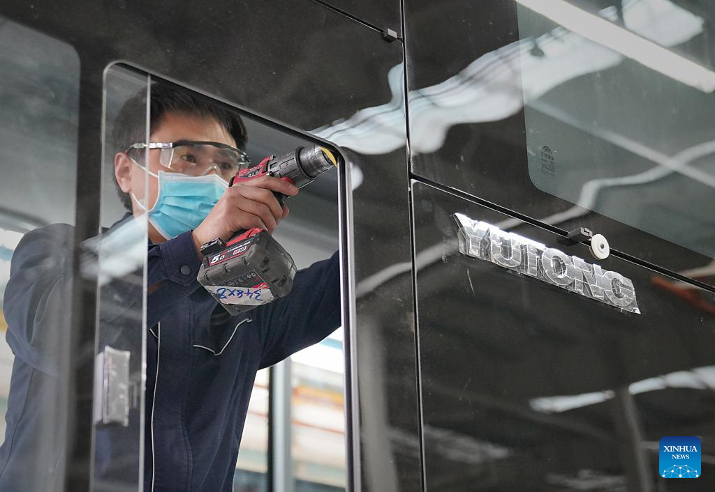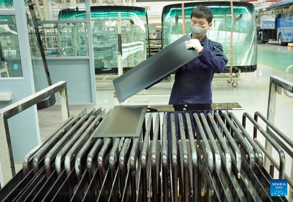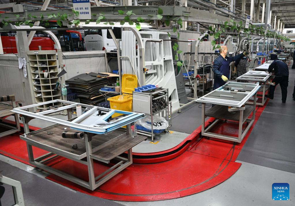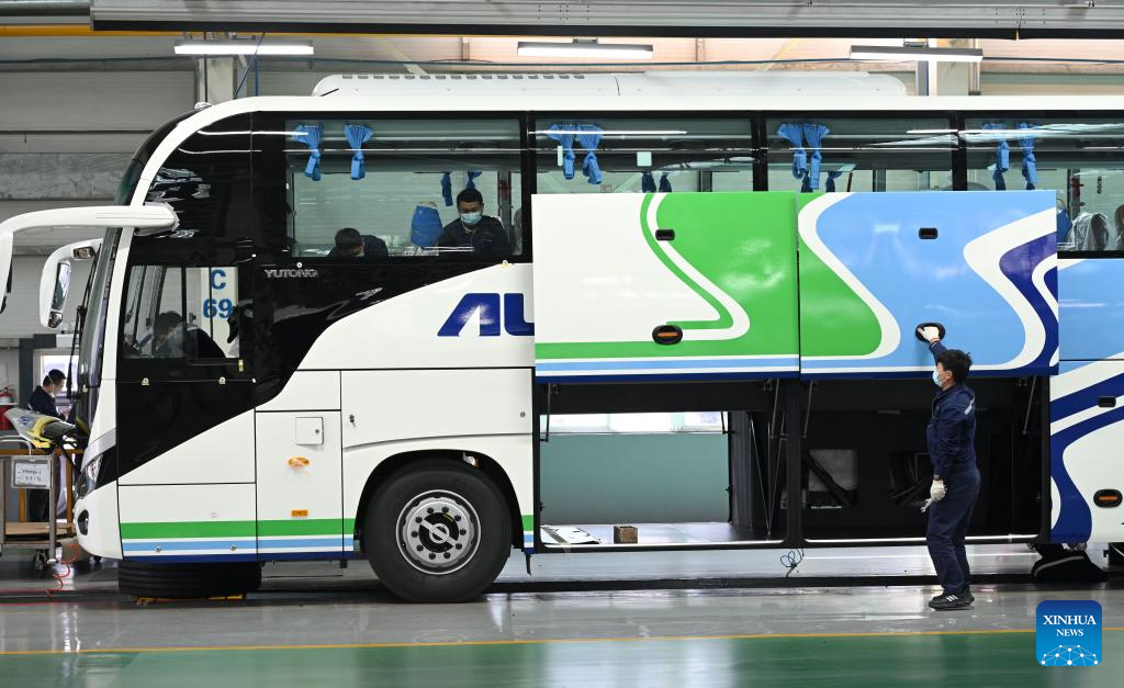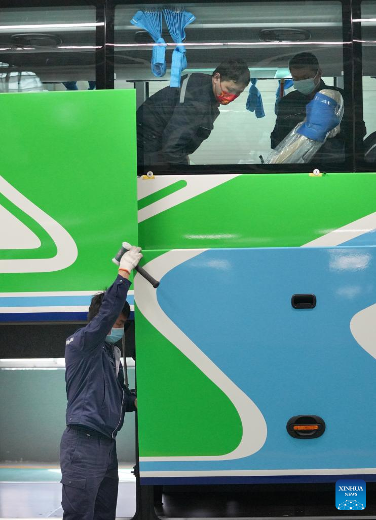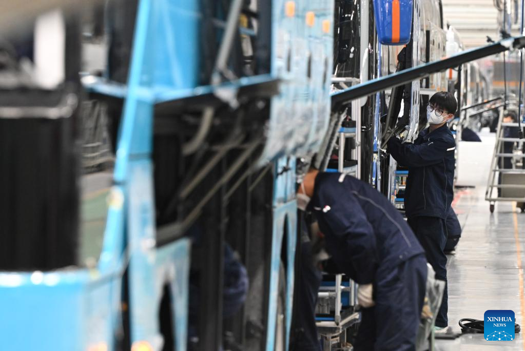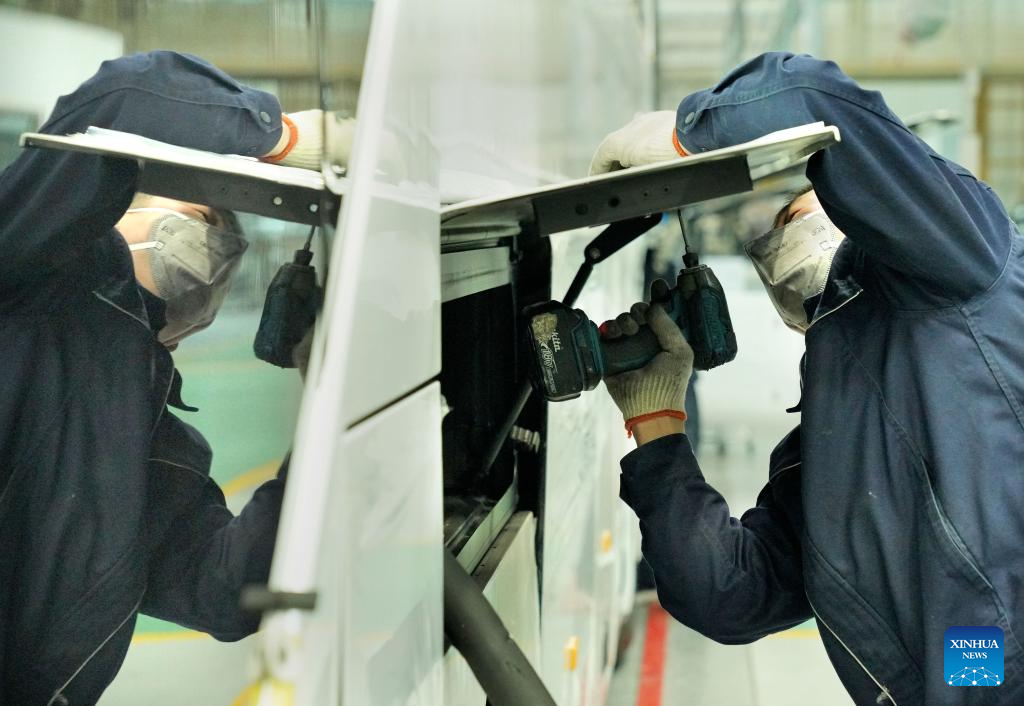 A staff member assembles the door of a bus at a work shop of the new energy factory of Zhengzhou Yutong Bus Co., Ltd. in Zhengzhou, central China's Henan Province, March 8, 2023. To catch orders, staff of the new energy factory of Yutong are busy on the assembly line. Since the beginning of this year, Yutong. who exported its bus to more than 30 countries and regions, has won many overseas orders. (Xinhua/Li An)