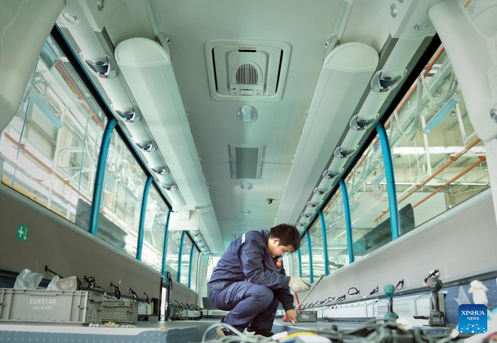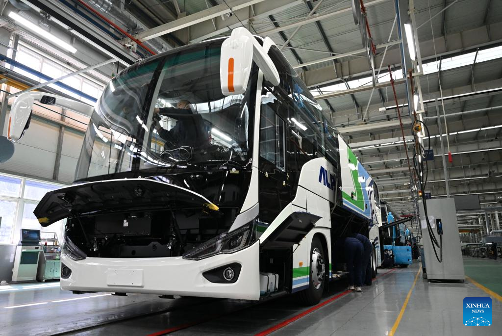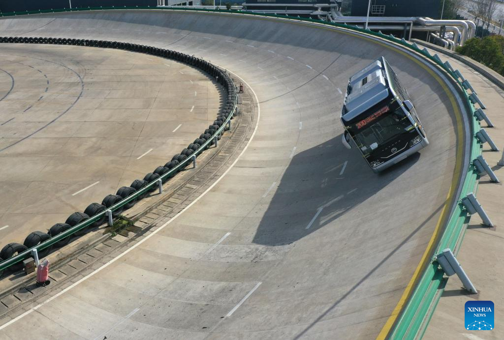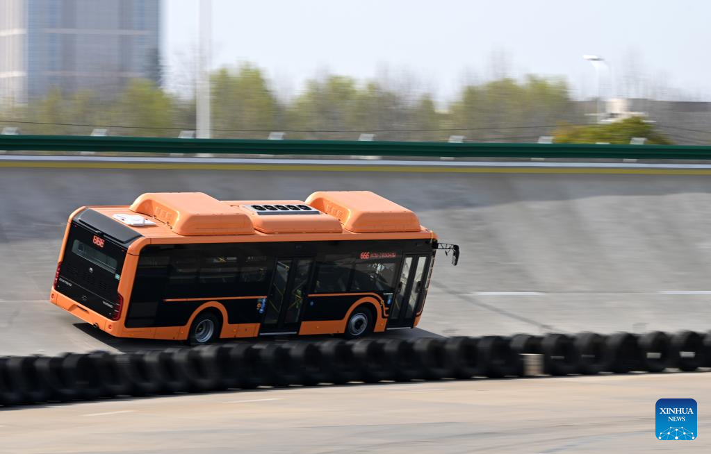 A new energy bus is tested at the test site of Zhengzhou Yutong Bus Co., Ltd. in Zhengzhou, central China's Henan Province, March 8, 2023. To catch orders, staff of the new energy factory of Yutong are busy on the assembly line. Since the beginning of this year, Yutong. who exported its bus to more than 30 countries and regions, has won many overseas orders. (Xinhua/Li Jianan)