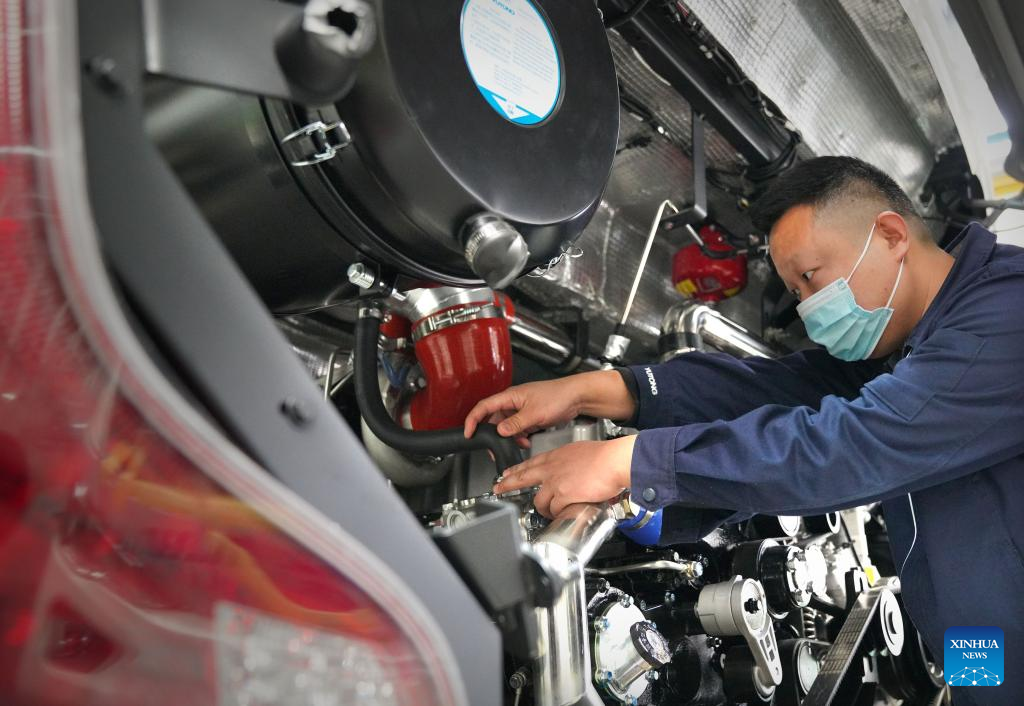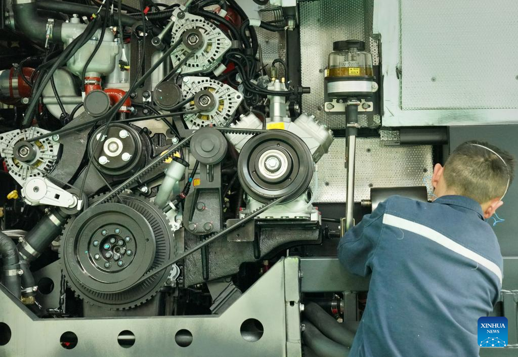 A staff member tests the engine of a bus at a work shop of the new energy factory of Zhengzhou Yutong Bus Co., Ltd. in Zhengzhou, central China's Henan Province, March 8, 2023. To catch orders, staff of the new energy factory of Yutong are busy on the assembly line. Since the beginning of this year, Yutong. who exported its bus to more than 30 countries and regions, has won many overseas orders. (Xinhua/Li An)