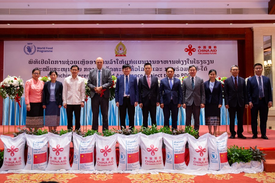 A launching ceremony for China contributing food and nutrition assistance, through the United Nations World Food Programme (WFP), to Lao school children is held in Vientiane, capital of Laos, Nov. 22, 2022. (Photo by Kaikeo Saiyasane/Xinhua)