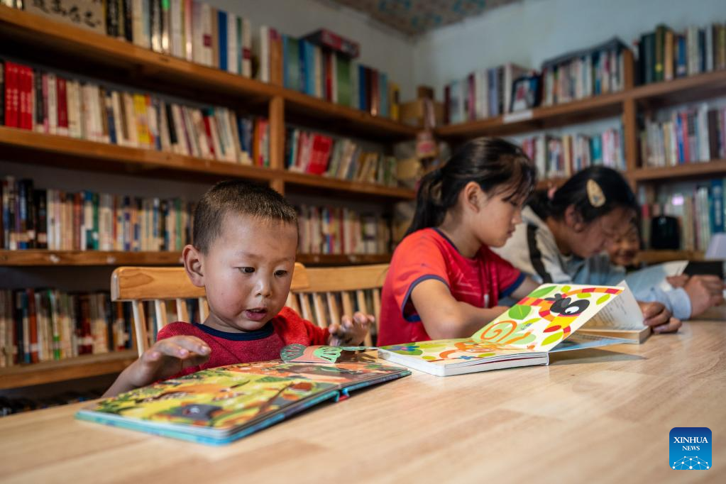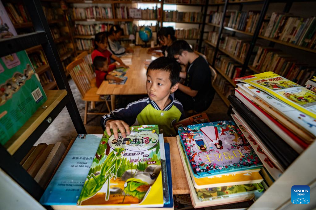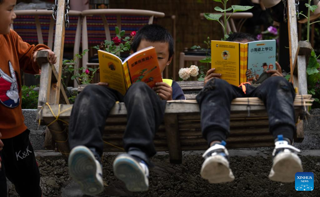 Children read books at the "Banshan Huayu" library in Qiunatong Village of Bingzhongluo Township in Gongshan Dulong and Nu Autonomous County, Lisu Autonomous Prefecture of Nujiang, southwest China's Yunnan Province, July 5, 2023. (Xinhua/Jiang Wenyao)