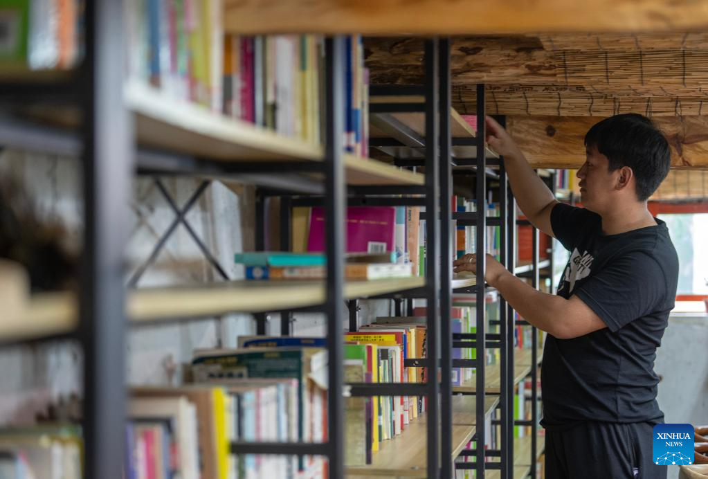Gan Wenyong arranges books at the "Banshan Huayu" library in Qiunatong Village of Bingzhongluo Township in Gongshan Dulong and Nu Autonomous County, Lisu Autonomous Prefecture of Nujiang, southwest China's Yunnan Province, July 5, 2023. (Xinhua/Fei Maohua)