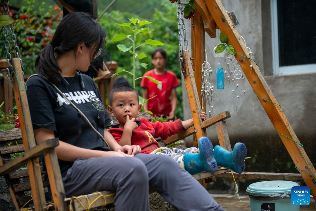 Volunteer Li Miao'en talks with a child at the "Banshan Huayu" library in Qiunatong Village of Bingzhongluo Township in Gongshan Dulong and Nu Autonomous County, Lisu Autonomous Prefecture of Nujiang, southwest China's Yunnan Province, July 5, 2023. (Xinhua/Xu Jiayi)