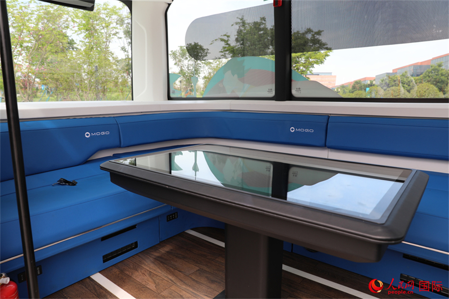 ?Photo shows an interior view of a new energy autonomous bus at the Universiade Village in Chengdu, southwest China's Sichuan Province. (People's Daily Online/Fu Yuanyuan)