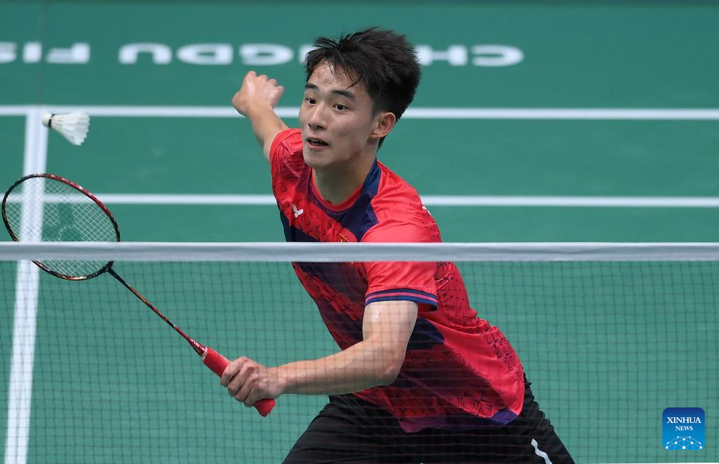 Wang Zhengxing of China competes during the men's singles match against Saran Jamsri of Thailand in the Badminton Mixed Team Semifinal match between team China and team Thailand at the 31st FISU Summer World University Games in Chengdu, southwest China's Sichuan Province, Aug. 2, 2023. (Xinhua/Zhang Duan)