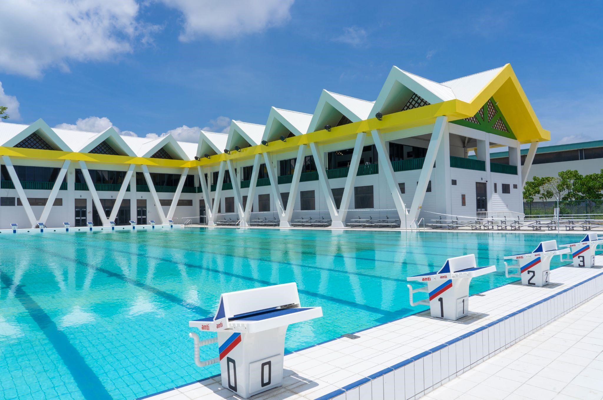 Photo taken on Sept. 12, 2023 shows the aquatic center for the 2023 Pacific Games, which was constructed with Chinese aid in Honiara, capital of Solomon Islands. (Photo/Ji He)