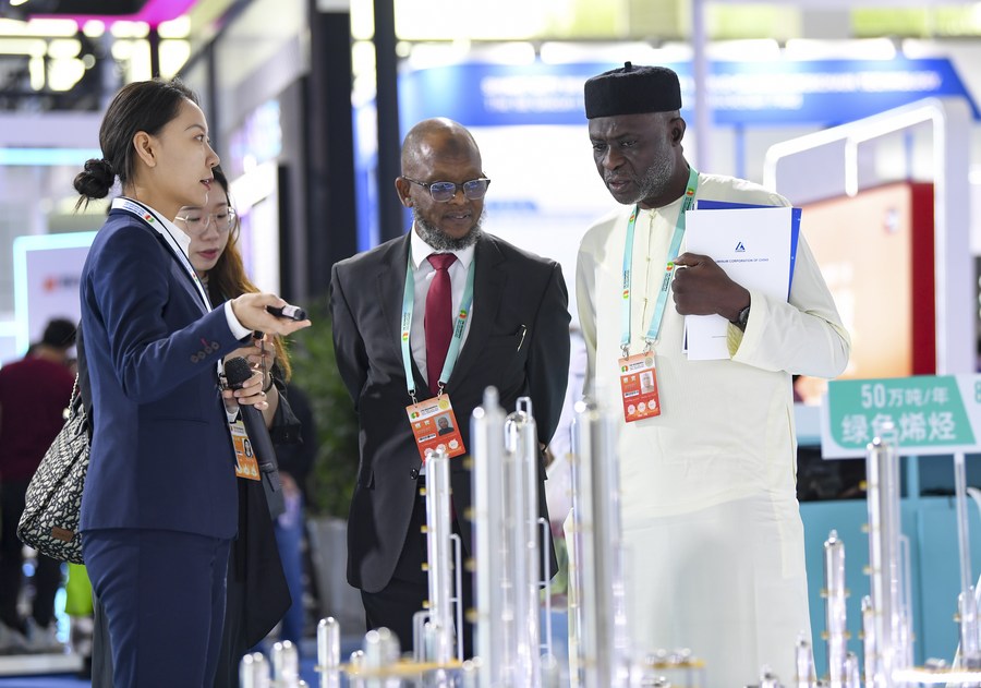 Guests learn about a clean energy project at the sixth China-Arab States Expo in Yinchuan, northwest China's Ningxia Hui Autonomous Region, Sept. 22, 2023. (Xinhua/Feng Kaihua)
